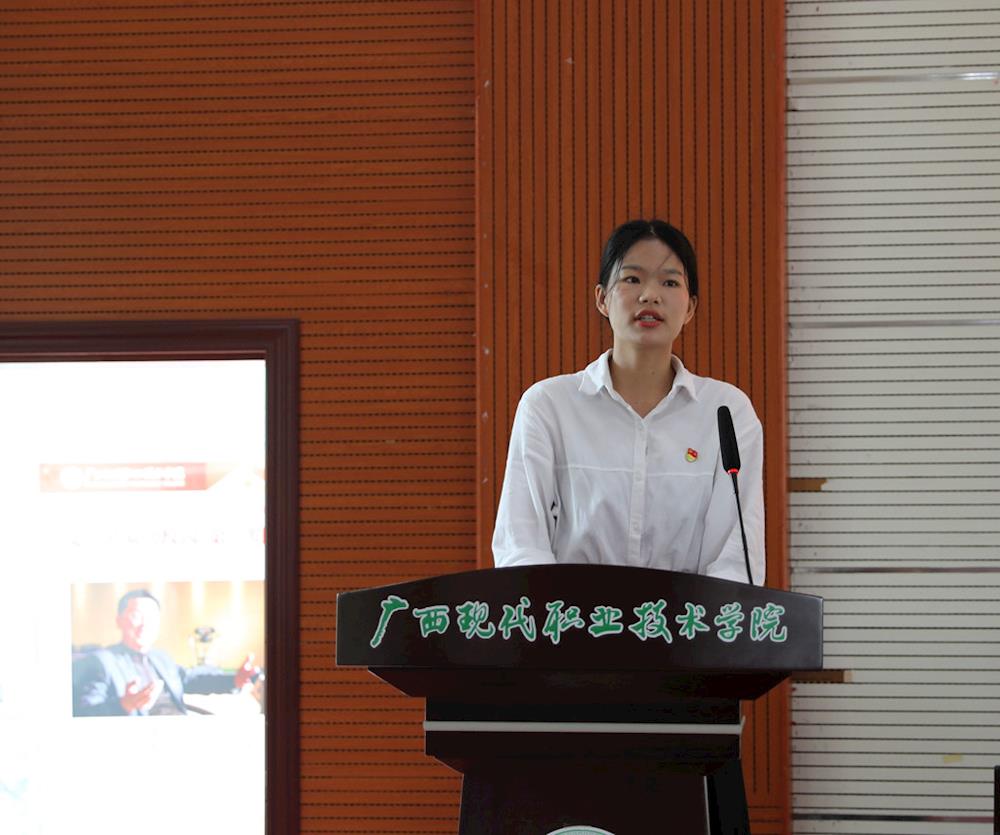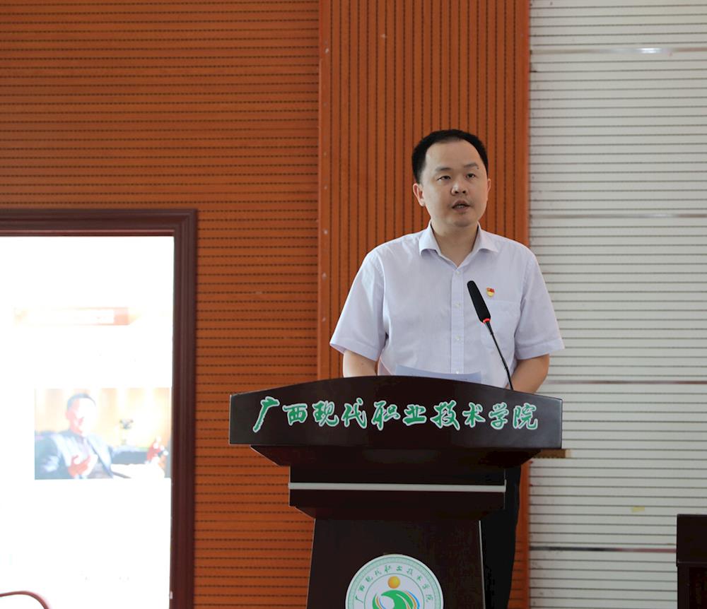 张斌书记宣读《中国共产党广西现代职业技术学院委员会关于批准刘宏壮等62名同志为中共预备党员及同意韦世安等14名预备党员转正的通知》。