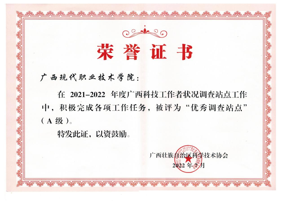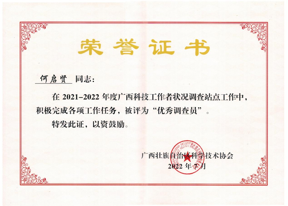 2022年7月13-15日,由广西科学技术协会主办、柳州科学技术协会承办的全区调查站点培训班在柳州市举办,我校科研处梁建梭同志参加了培训。会上对2021-2022年度广西科技工作者状况调查站点工作进行了总结表彰。我校调查站是第一年设站,但仍按质按量完成各项工作任务,被评为优秀调查站点(A级)。何启贤老师被评为优秀调查员。