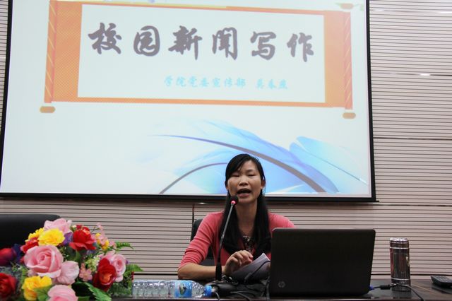 院党委宣传部、学生工作处讯(曾严 李铃) 为给我院热爱新闻写作的学生提供一个学习交流的机会,进一步提高同学们的新闻写作水平,构建一支适合学院发展需要的宣传骨干队伍,推动我院宣传和新闻报道工作再上新台阶,2012年6月5日晚,学院党委宣传部、学生工作处在学院第二学术报告厅举办校园新闻写作培训,由宣传部莫春燕老师主讲。