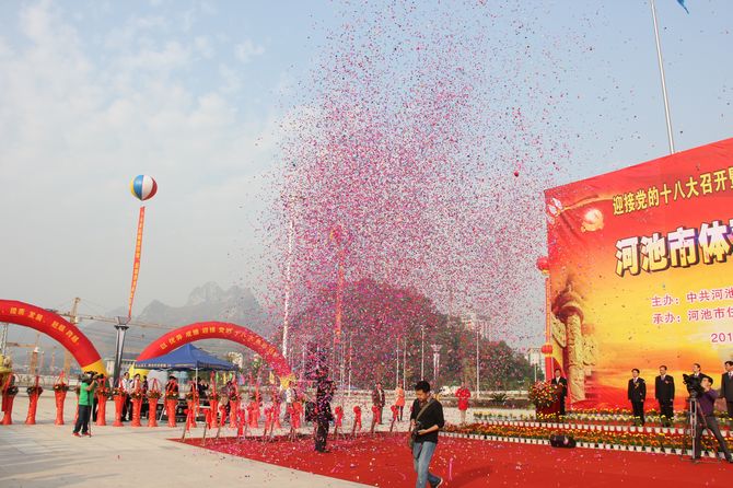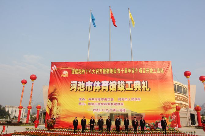 学院党委宣传部讯 2012年11月2日上午,河池市体育馆举行竣工典礼。市委书记、市人大常委会主任黄世勇宣布项目竣工交付使用,市长何辛幸致辞。我院全体师生参加了竣工典礼。