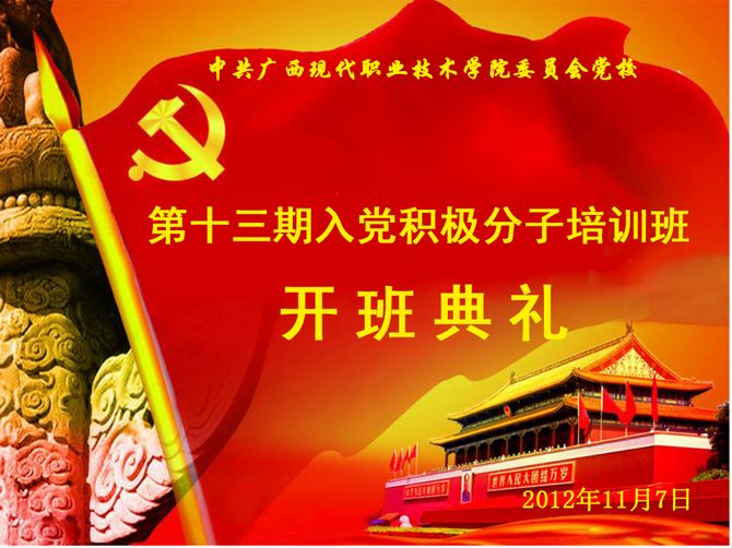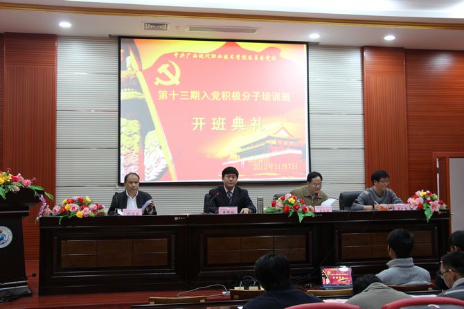 学院党委组织部讯(潘华林) 广西现代职业技术学院党校第十三期入党积极分子培训班开班典礼在学院第二学术报告厅隆重举行。学院党委书记韦伟松、学院党委副书记覃志航、学院党委组织部部长罗之尚、组织部组织员邓福田、各党总支书记及入党积极分子300多人参加开班典礼。开班典礼由学院党委副书记、纪委书记覃志航同志主持。