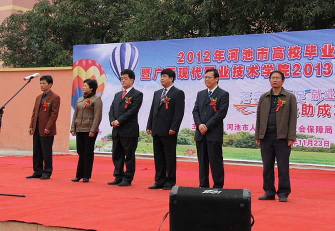 党委宣传部讯(曾严)2012年11月23日,由河池市人力资源和社会保障局、广西现代职业技术学院联合举办的2012年河池市高校毕业生就业服务周暨我院2013届毕业生校园双选会,在我院文体广场举行。河池市副市长韦祖林、学院党委书记韦伟松、河池市人力资源和社会保障局局长李凤云、河池市就业局局长韦振飞、学院副院长冯忠伟出席开幕式。开幕式由河池市人力资源和社会保障局副局长罗凤中主持。