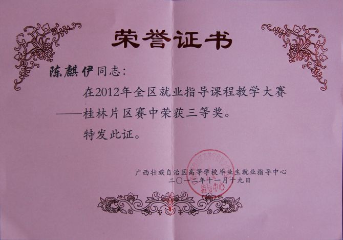 又讯 近日,从自治区高等学校毕业生就业指导中心获悉,在2012年全区就业指导课程教学大赛片区赛中,我院辅导员陈麒伊老师荣获桂林片区赛三等奖。