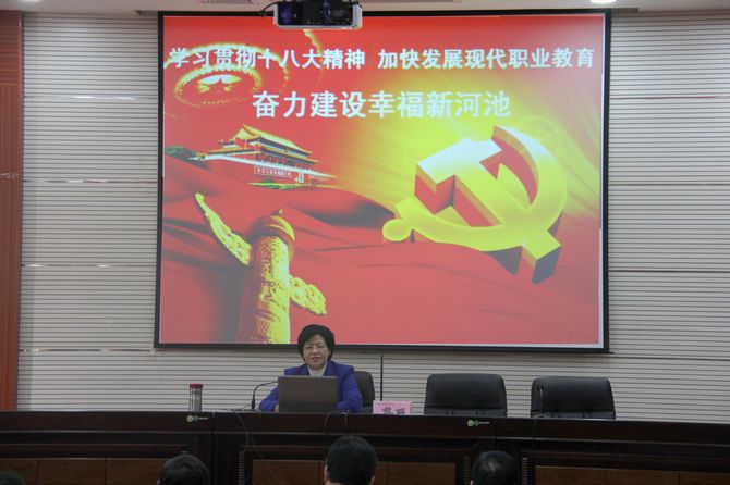 报告会上,黎丽详细介绍了党的十八大的重要意义,深入分析了党的十八大报告提出的一系列新观点、新表述,并结合河池实际,结合河池现代职业教育,就我市如何推进“五大工程”建设,落实“八新”目标要求,建设幸福新河池作具体的要求和部署。