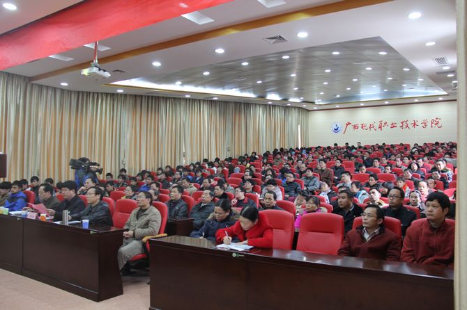 学院党委宣传部讯(曾严 李媛媛) 为深入学习贯彻党的十八大精神,加快发展现代职业教育,根据河池市委学习党的十八精神宣讲工作的统一安排,2013年元月8日下午,河池市十八大精神宣讲团成员,河池市市委常委、宣传部部长、副市长黎丽同志在我院第二学术报告厅作了题为《学习贯彻十八大精神,加快发展现代职业教育,奋力建设幸福新河池》的宣讲报告。学院党委书记韦伟松主持报告会并作重要讲话。