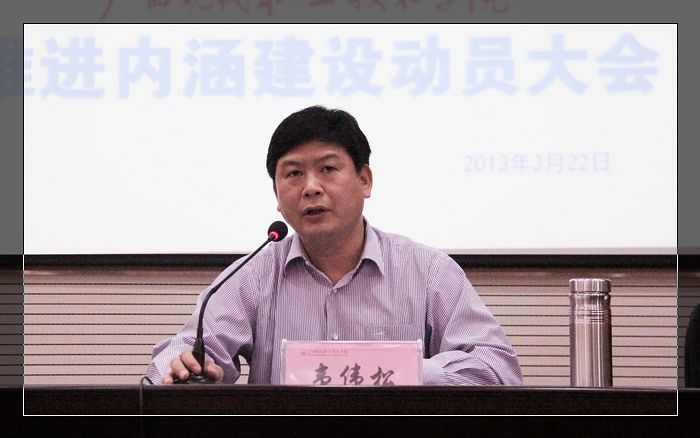 党委宣传部讯 今年是我院全方位打造内涵建设的攻坚年,为了更深入地开展学院内涵建设,实现“学院梦”,2013年3月22日下午,我院在第二学术报告厅召开了推进内涵建设动员大会。学院党委书记韦伟松,以及学院全体教职工参加了此次会议。会议由学院党委副书记、纪委书记覃志航主持。