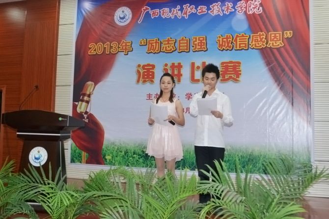 演讲台上,参赛选手结合自己和身边的事例,围绕主题,进行声情并茂、感人肺腑的演讲,表达他们对国家资助政策的感恩之情。选手们的激情演讲,获得了在场领嘉宾、评委以及观众的一致好评。最后,来自经济管理系和机电工程系的覃梓岚、梁永吉分获演讲比赛的一二名,并作为学院选手参加全区高校资助演讲比赛复赛。