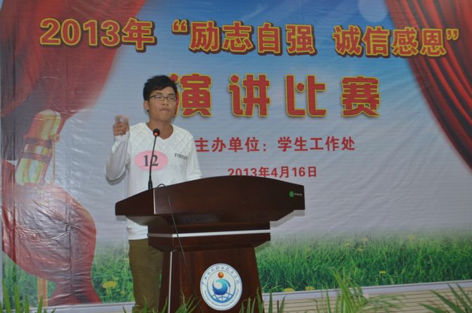 学院学工处讯 为宣传党的资助政策,教育同学们感恩党,感恩祖国,激发同学们立志成才的信念,拓宽同学们的知识面,2013年4月16日晚7:30,学院学生工作处在学院第二学术报告厅组织举行“励志自强,诚信感恩” 2013年全区高校资助演讲比赛选拔赛。