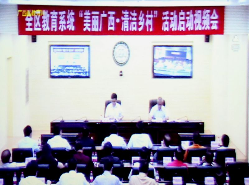 党委宣传部讯 2013年5月7日上午,全区教育系统“美丽广西・清洁乡村”活动启动视频会在南宁举行,自治区高校工委书记、教育厅厅长秦斌出席会议并做重要讲话,视频会由教育厅副厅长郭连科主持。学院党委副书记、纪委书记覃志航,学院副院长冯忠伟以及党委宣传部、后勤处、学工处、保卫处、各教学系等部门单位相关人员在学院第二学术报告厅参加分会场视频会。