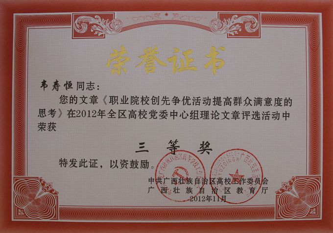 院党委宣传部讯 为深入推进学习型党组织建设,充分展示全区高校党委中心组的学习成果,以优异的成绩迎接党的十八大胜利召开,自治区高校工委举办了全区高校党委中心组理论文章评选活动。日前,自治区高校工委下发《关于公布2012 年全区高校党委中心组理论文章评选结果的通知》,对全区54篇理论文章进行表彰。我院纪检办主任韦寿恒的理论文章《职业院校创创先争优活动提高群众满意度的思考》获三等奖。