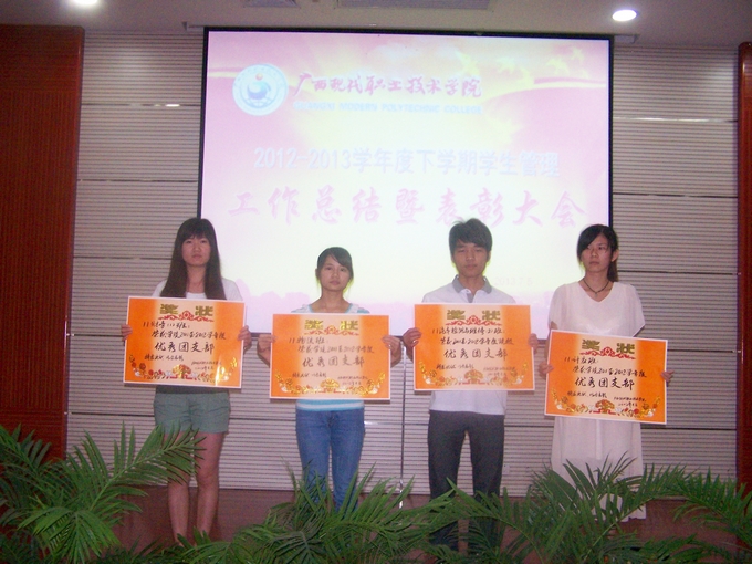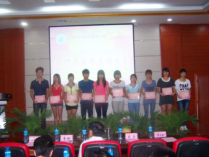 大会首先由学工处副处长岑华,学工处副处长李玲,学工处副处长、团委副书记黄仕珍分别作了2012--2013学年度下学期学生管理工作小结、学生资助工作小结、学生活动工作小结。随后,岑华副处长宣读了本学期我院受自治区、市、学院各级表彰的先进集体和先进个人名单。与会领导分别为荣获先进集体和先进个人颁奖。