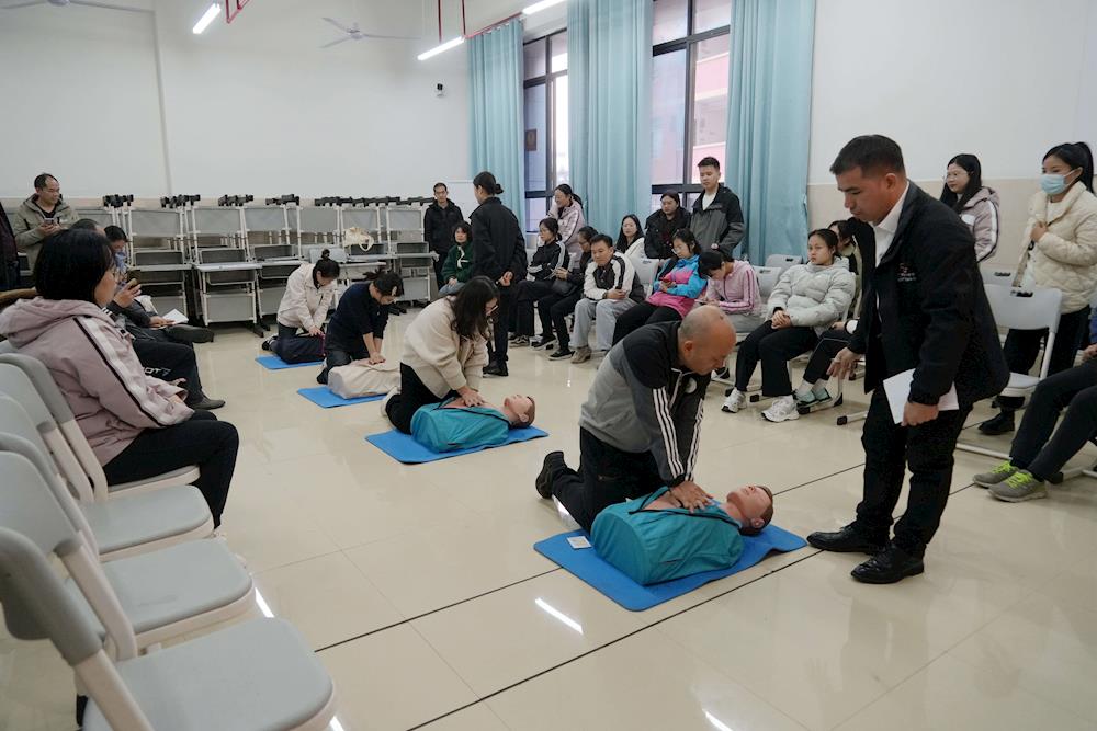 韦伟松在会上讲话。韦伟松指出,深入开展红十字救护员、急救教育培训是学校做好健康教育和素质教育的重要内容,也是促进平安校园建设的重要举措。学校将坚持生命至上的工作理念,积极探索适宜学校的急救教育培训模式,全力打造学校“五维五强化”急救教育体系,并以全国学校急救教育试点建设工作为目标,扎实做好做精做强急救教育,全面提升师生急救教育意识和技能,不断完善红十字应急救护培训基地建设工作,让学校急救教育工作再出新成效。