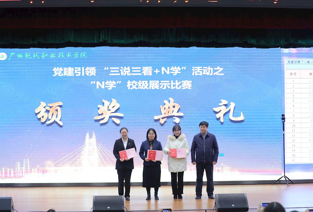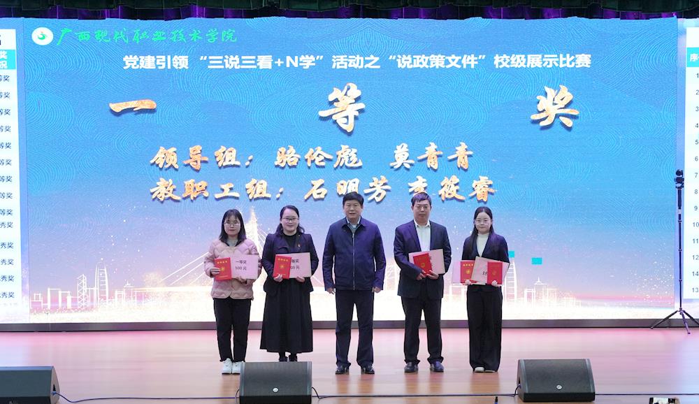 “三说三看+N学”,是我校党委以“党建引领,注重实效”为原则开展的教师综合素质能力提升学习活动。“三说”是指说政策文件、说产业职业、说专业课程。通过“说形势政策”学习国家职业教育的最新方针政策,把握职业教育事业发展的新形势与新任务;通过“说产业职业”了解产业行业发展现状及前景,定位专业面向的职业,找准主要就业岗位;通过“说专业课程”展现教师教学内容、教学方法、课程特色及创新成果。“三看”是指看中央新闻、看广西新闻、看河池新闻。通过“三看”了解国家、区域经济社会发展动态,把握时代脉搏,将时政热点融入教育教学。“N学”是指教师结合自身实际自选学习内容以丰富知识结构,提高为人师者的素质和能力。
