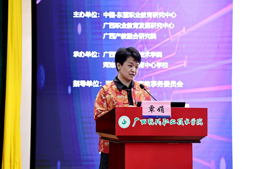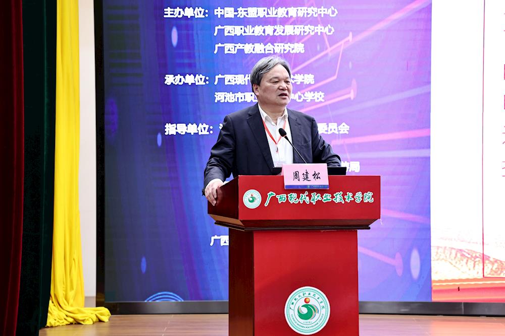 会上,教育部民族司原一级巡视员葛维威,中共广西区委党校、广西行政学院经济学教研部教授凌经球,中国高等教育学会职业技术教育分会会长周建松,广西社科院民族研究所所长、自治区党代表、人大代表覃娟作主旨报告;深圳职业技术大学校长许建领,河池市政协副主席、广西现代职业技术学院党委书记韦伟松,桂林旅游学院马克思主义学院党委书记、院长张雷作经验交流分享;中国职业技术教育杂志社常务副主编席东梅、广西机电职业技术学院党委书记黄小敬、乐山职业技术学院党委书记成定彬、重庆工业职业技术学院原书记王官成、深圳市第二职业技术学校校长王波、河池市职业教育中心学校党委书记黄丹峻在嘉宾沙龙进行交流。