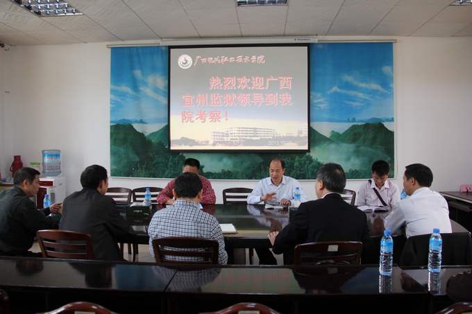 学院党委宣传部讯 2013年10月23日上午,广西宜州监狱党委书记、监狱长李明乾一行三人应邀到我院考察技能培训工作,市司法局局长李松涛等领导参加接待活动。院长助理韦胜东以及学院培训部、电子系、市司法局宣传教育科负责人等陪同接待。