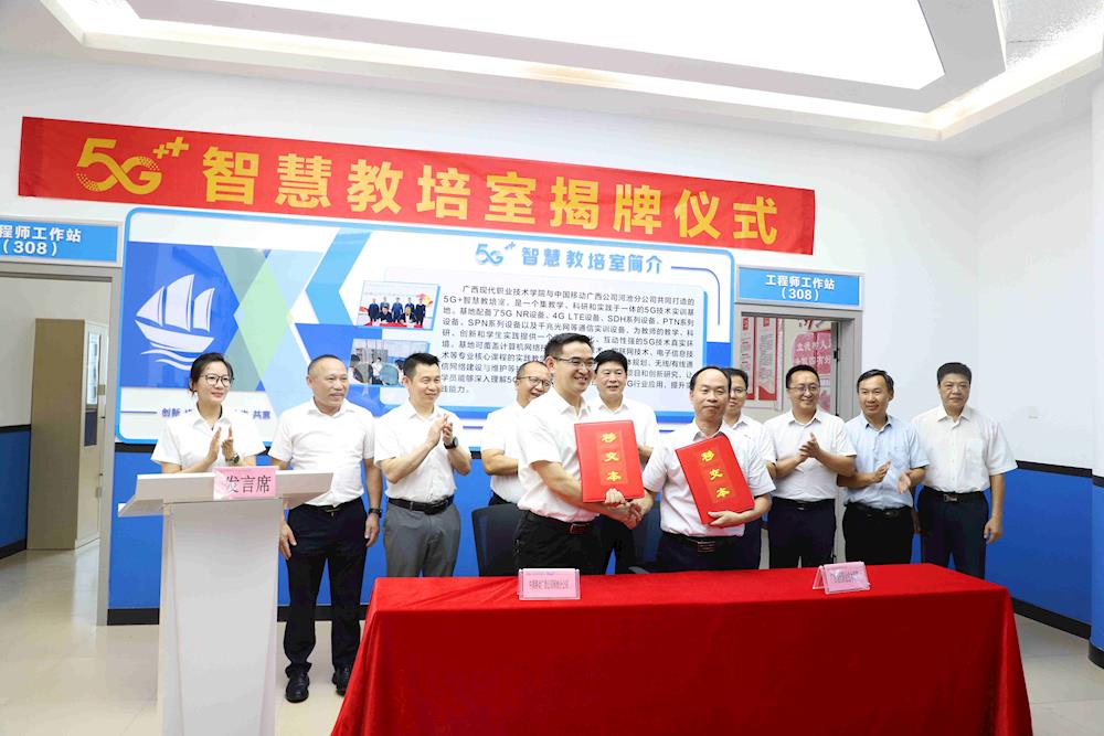揭牌仪式上,信息工程学院颜增显院长介绍校企合作情况;举行5G教培室资产移交、移动公司捐赠仪式,刘勃兰、梁朝益作为双方代表签字;韦伟松、刘江为5G教培室揭牌。