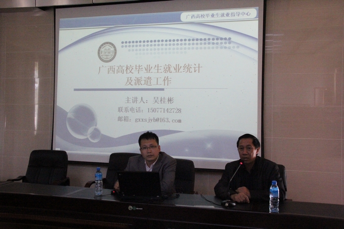 学院党委宣传部、就业办 11月19日,自治区教育厅就业指导中心主任吴桂彬到我院开展就业指导、培训工作,并在我院第一学术报告厅举办了就业指导工作培训会。院长助理韦胜东及各系主任、系党总支副书记、毕业班班主任、就业办全体人员参加了此次培训。