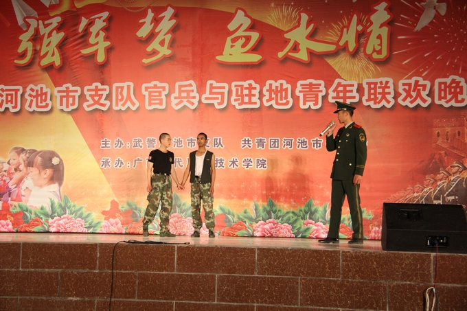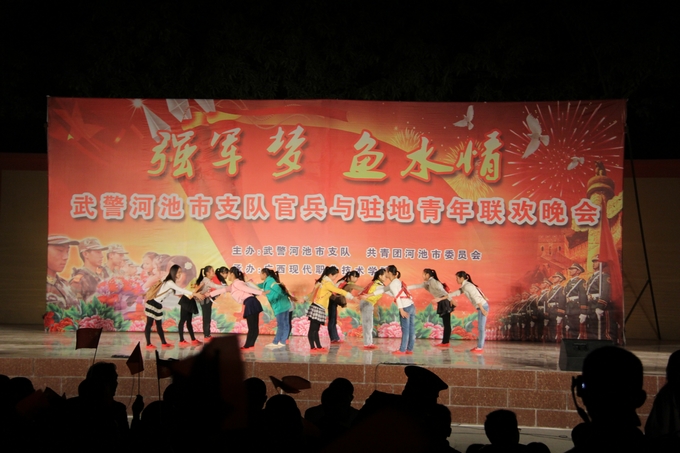 学院党委宣传部讯 为搭建驻河池武警官兵与地方青年交流平台,营造良好的拥军社会氛围。12月5日晚,由我院承办的“强军梦•鱼水情”武警河池支队官兵与驻地青年联欢晚会在学院文体广场举行。团河池市委书记杨胜涛,武警河池支队支队长练振波,团河池市委副书记杨哲、黄泽,学院院长助理韦胜东以及市直机关企事业单位团委负责人等出席了晚会。