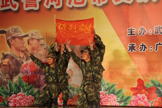 晚会现场,由我院学生出演的街舞《舞动青春》和歌伴舞《相亲相爱一家人》等自编节目,深受驻地武警官兵和广大观众的喜爱。