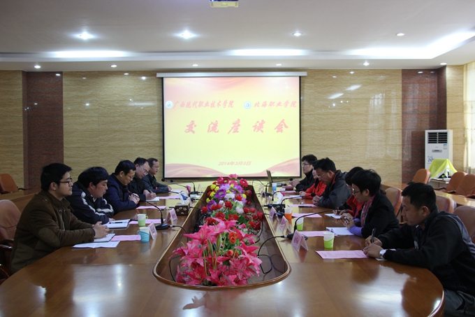 在学院图书馆会议室召开的两校交流座谈会上,两校与会人员就招生、教学管理及学生管理等各方面进行自由交流。林旺兴院长还在自由交流中作了发言,他说,广西现代职业技术学院是北海职业学院的友好办学伙伴,这几年来,广西现代职业技术学院在新一届领导班子的带领下,锐意进取,赶超跨越,取得了很大的进歩,我们学院此次组团参观考察,目的也是学习广西现代职业技术学院近几年来在招生、教学管理及学生管理等各方面的取得的重大成果。