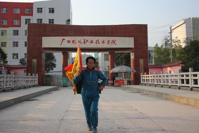 54岁的肖先高是湖南省芷江侗族自治县水宽乡电冲村的一位普通农民,由于从小体弱多病,从十一二岁开始练长跑,这一跑就是三十多年,跑烂了四百多双鞋,行程六十余万公里,在祖国大江南北都留下了他的足迹。肖先高对笔者说,他这次是跑步去宝岛台湾,路过河池这所优美的广西现代职业技术学院,想在此短暂休息调整,顺便感受一下大学里的书香氛围和浓郁的校园文化,再继续前往目的地。