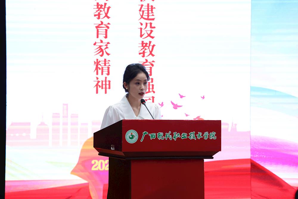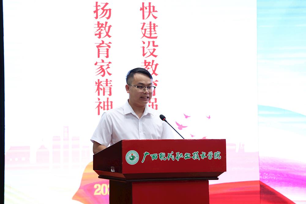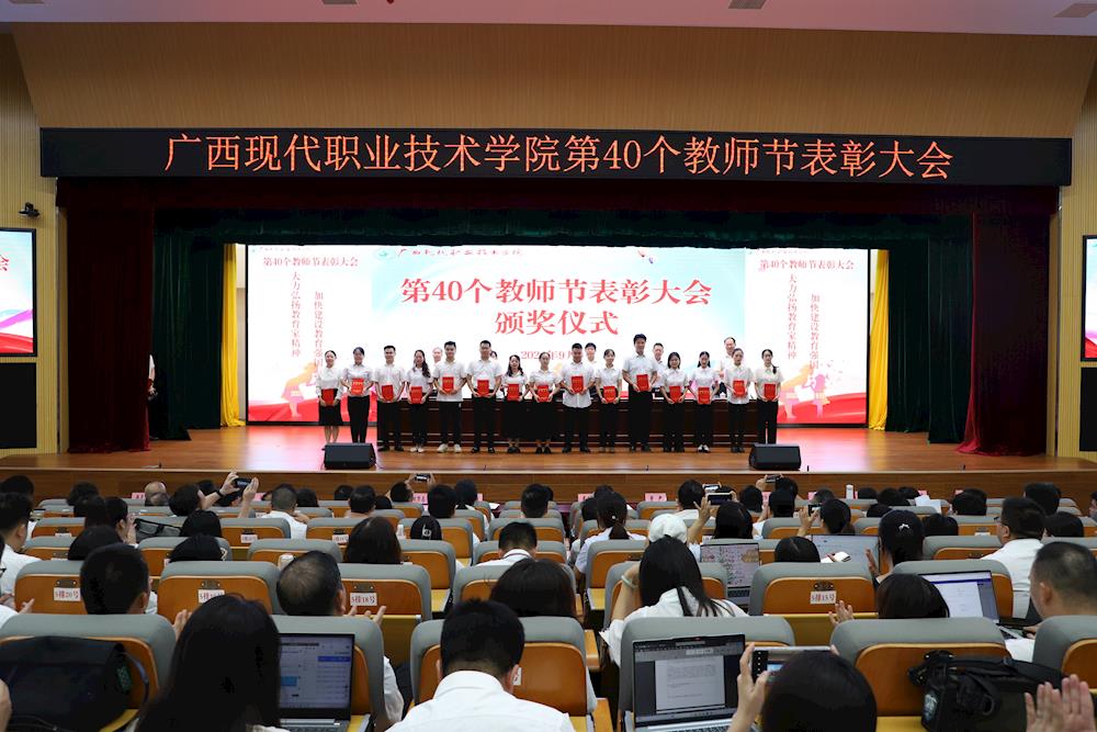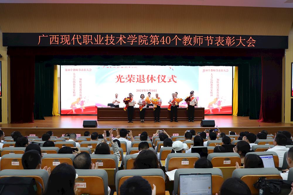 在第40个教师节即将到来之际,9月9日下午,我校在综合楼二楼东报告厅召开2024年教师节表彰大会,对2023—2024学年度在教育教学、管理服务、技能大赛、招生就业、科学研究、社会服务等工作中涌现出来的一批表现突出的先进集体和先进个人进行表彰,并为退休老教师举行光荣退休仪式。河池市政协副主席、学校党委书记韦伟松,党委副书记唐克胜,副校长黄耀、杨奎、梁朝益出席会议,全体教职工参加会议。会议由杨奎主持。