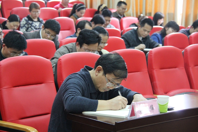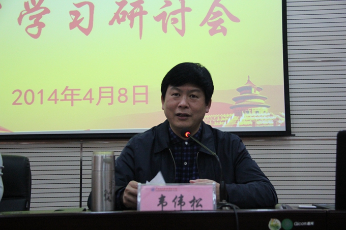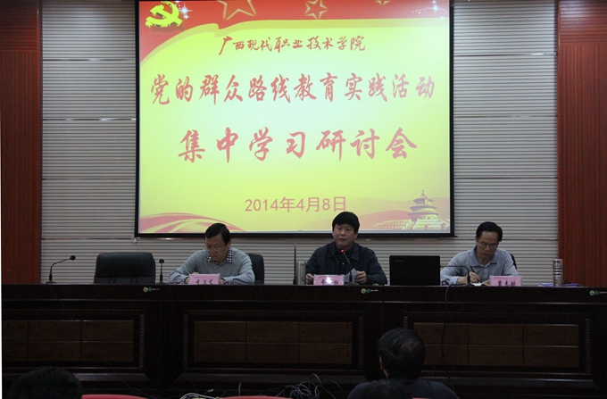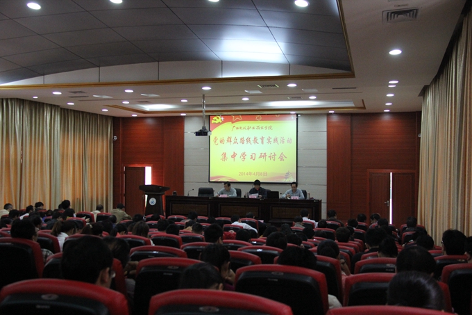 学院教育实践活动办讯 4月8日下午,我院在第二学术报告厅召开党的群众路线教育实践活动第四次集中学习研讨会。市委副秘书长、学院党委书记韦伟松出席会议并作题为《践行社会主义核心价值观 争当优秀共产党员》专题报告。学院纪委书记覃志航,副院长冯忠伟等中层以上领导干部以及全体党员参加了学习研讨会。