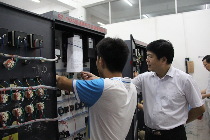 学院党委宣传部讯 6月12日,市委副秘书长、学院党委书记韦伟松在副院长冯忠伟以及相关部门负责同志的陪同下,分别深入汽车实训室、数控实训室、电子电力实训室、精细化工产品实验室、工业分析实训室、计算机基础实训室等地现场抽查学生技能测试情况。