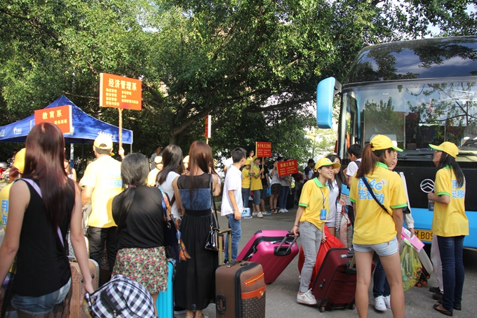 新生初次走进大学校园,对所有的东西都是陌生的。为了给新生提供细致周到的服务,让新生和家长在报到的时候有头绪,学院党委专门开会研究“迎新”事宜,各系都做了精心的准备。在各系的新生报到处,记者看到从咨询到检录再到填写学生信息等都有详细的指示牌,并且每个地点都有专门的大学生志愿者负责帮助。这样一来,新生和家长不用费事就能“一站式”地完成办理入学的所有手续。“把名字填在这里。”“这样写就行!”旁边的志愿者不停地指点着新生。 签到指示清楚,志愿者服务也特别到位。为了让初次踏入大学校园的新生能顺利找到自己的寝室,每个教学系都出动了百余名志愿者。记者了解到,在这里,只要新生办理完手续后,就会有志愿者把他们送到自己的寝室。这个过程中,志愿者还充当起“搬运工”。“我都已经爬了8趟6楼了。”志愿者小张同学笑着说。