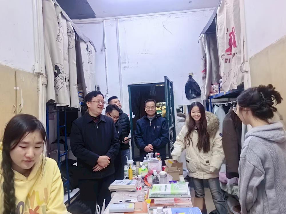 岑华带队走访教师教育学院学生宿舍,对宿舍的卫生、内务及安全等方面进行了细致检查,并认真听取同学们的意见和建议,鼓励同学们要保持良好的生活习惯。
