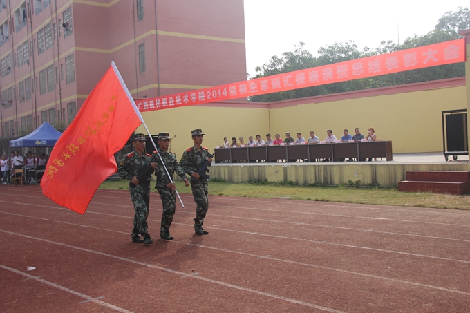 党委宣传部讯 飒爽英姿秋点兵,激昂斗志威震天。9月15日,我院2014级学生军训汇报表演暨总结表彰大会在学院田径运动场隆重举行。纪委书记覃志航在会上作军训总结讲话。副院长韦胜东宣读军训表彰决定。大会由学工处处处长岑华主持。武警河池市支队参谋长范长俊,学工处、团委、教科处、后勤处、保卫处、各教学系有关领导老师以及2300多名参训新生参加大会。