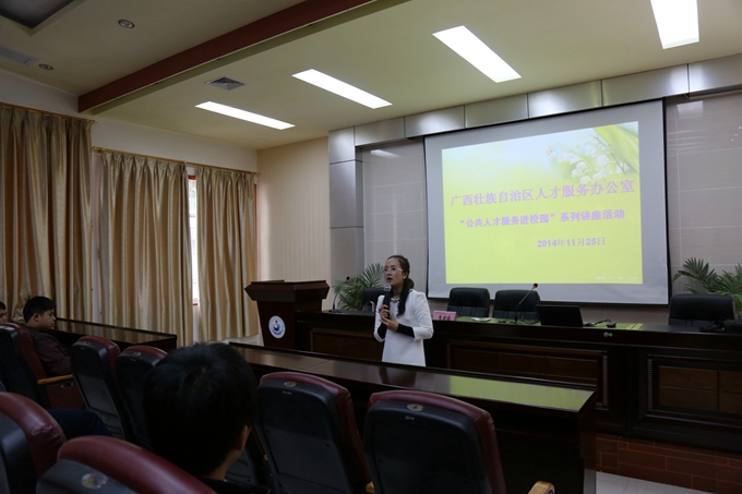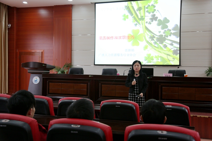学院就业办讯 11月25日,国内知名人力资源实操派专家、广西人力资源服务行业协会副秘书长、就业指导专家委员会专家,国家职业指导师郭新娟;注册国际人力资源师、注册高级形象设计师、广西高校毕业生就业服务部部长助理李晓晗,应邀到我院作就业指导专题讲座。讲座由副院长韦胜东主持,学院就业办有关同志及15届全体毕业生参加了专题培训。