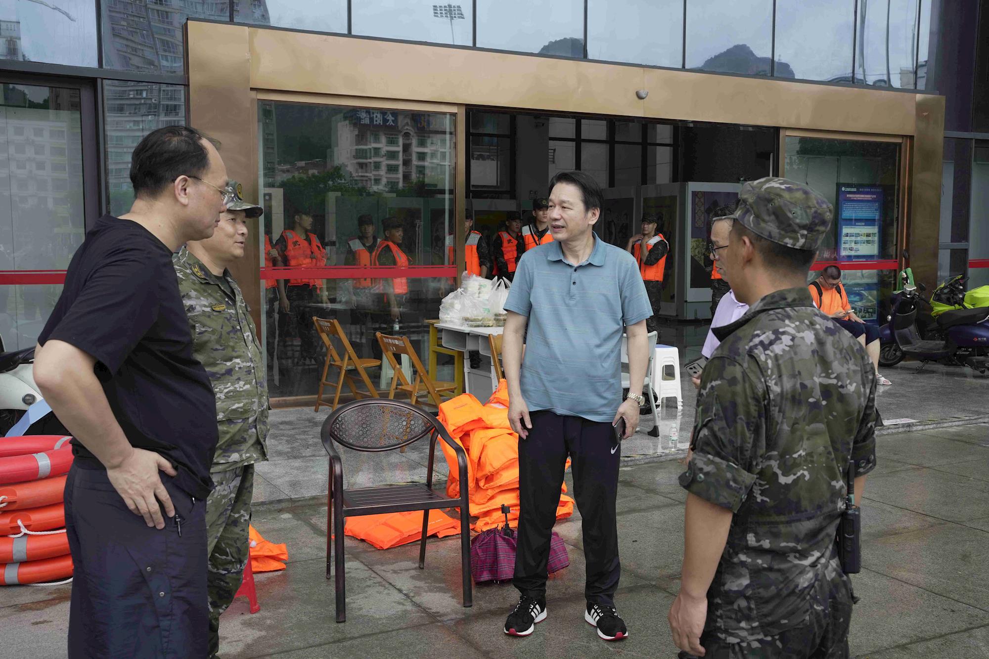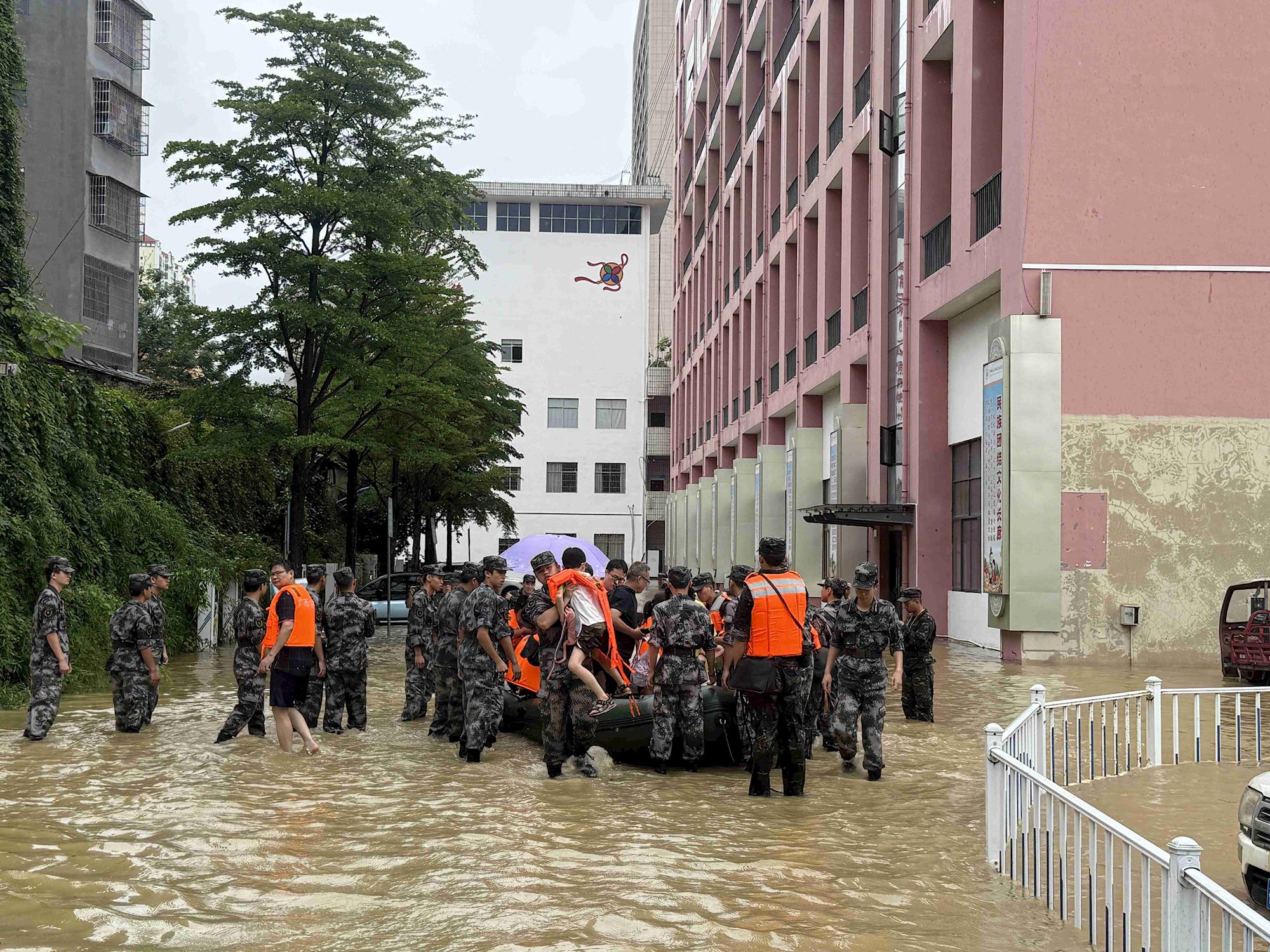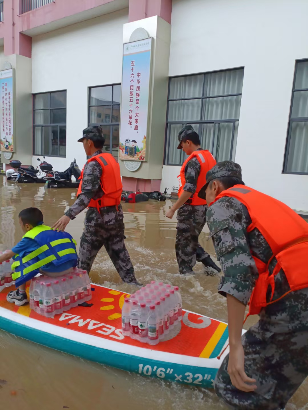 在6月21日上午,水位迅速猛涨之时,河池市救援大队、武警部队、应急管理局的人员火速赶到学校。8艘冲锋舟、150多名官兵迅速投入到救援行动中。他们蹚着齐腰深的积水,与学校师生并肩作战,转移师生和校内居民,运送物资,发挥重要作用,成为抢险救援的中坚力量。冲锋舟在湍急的水流中穿梭,一次次将被困师生和校内沿河住宿楼居民转移到安全地带。