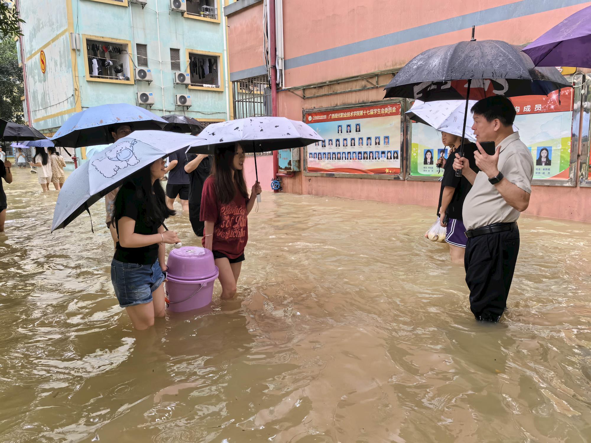 险情就是命令!学校党委迅速行动起来。河池市政协副主席、学校党委书记韦伟松第一时间带领校领导班子成员火速赶赴学校,冲在抢险救援的第一线,深入到积水最深的区域,实地查看险情,了解被困师生情况,现场指挥抢险救援工作。与此同时,正在外出的校长黄绍光和分管后勤的梁朝益副校长也紧急返回学校,并通过线上方式与书记协同指挥救援。在学校领导的迅速部署和各方的紧密配合下,一场紧张而有序的抢险救灾工作在学校全面展开。