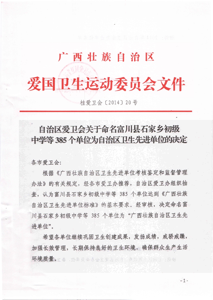 后勤管理处讯 日前,在广西壮族自治区爱国卫生运动委员会组织的年度卫生评比中,我院荣获2014年自治区卫生先进单位,成为385个先进单位之一。