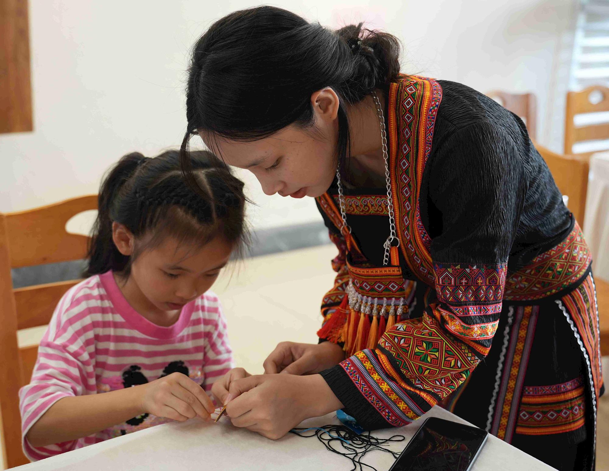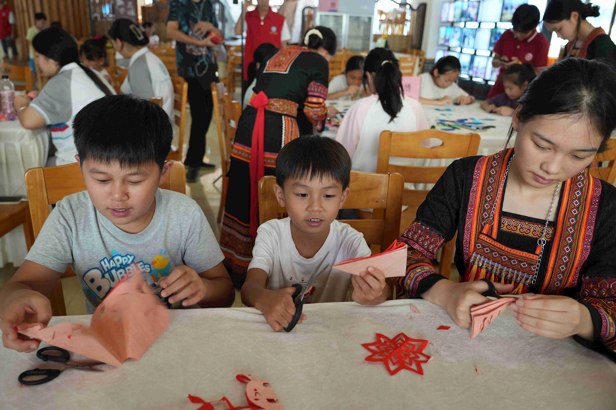 发布会后,由职教中心团委主办的“携手同行、筑梦未来”民族文化传承社区教育公益活动,让参会人员沉浸式的感受民族文化魅力。来自两校及河池寿乡园的教师、学生干部,化身“民族文化传承使者”,给大家送上一场丰盛的民族文化大餐。家长、孩子们一边品尝烹饪大师精心制作的民族糕点,一边轮流体验泥塑、刺绣、剪纸、彩绘、面点、果饮等制作,还快乐的玩起奥尔夫音乐互动、帐篷捉迷藏等游戏……