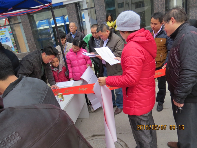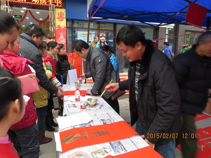 学院党委宣传部讯 2015年2月7日,广西现代职业技术学院联合河池市市直书法家协会在河池城西客运站购物广场前开展迎新春义写义赠春联活动,河池市市直书协主席龙介池、常务副主席潘立举、秘书长蒙家辉、副秘书长郭旷应邀参加活动并为市民现场义写春联。
