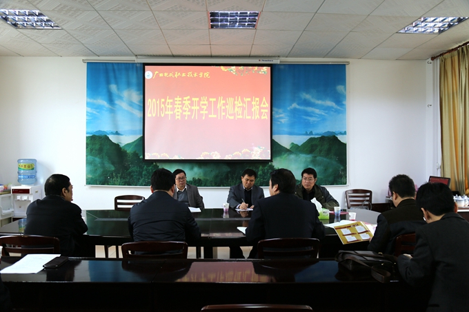 学院党委宣传部讯 3月13日上午,以自治区教育厅师范处处长李勇齐为组长的教育厅2015年春季学期开学初工作巡视检查组一行来到我院,对我院开学工作进行全面细致的专项检查。市委副秘书长、学院党委书记韦伟松,院长黄绍光,市教育局副局长文德生等陪同检查调研。