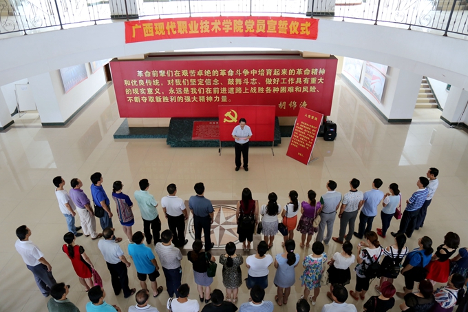 表彰大会结束后,在学院党委副书记、院长黄绍光带领下全体党员及示范校建设骨干队伍成员、信息化建设骨干队伍成员前往河池市革命纪念馆开展重温入党誓词活动,并参观了革命斗争史陈列馆展厅等,自觉接受革命传统教育。