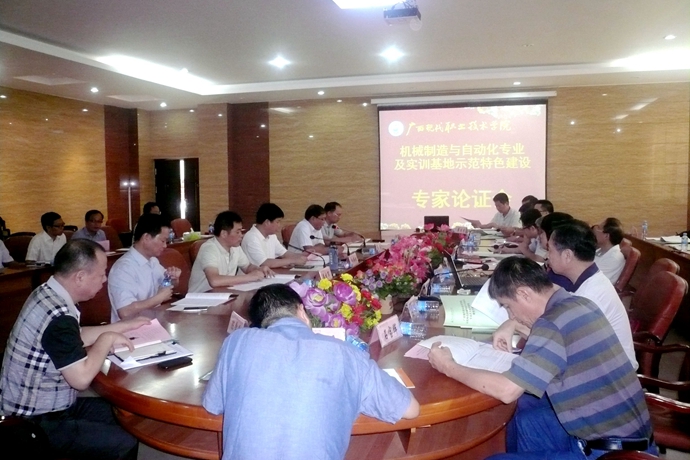 2015年8月12日,我院举行机械制造与自动化专业实训基地设备采购专家论证会。广西大学黄伟教授、深圳职业技术学院机械工程学院院长梁伟文教授、南宁职业技术学院机电工程学院院长甘善泽、柳州职业技术学院机电系副主任王大红、广西机械工业联合会秘书长王珏,广西汽车拖拉机研究所所长覃日才、国泰安公司广西区项目总监赵冰蔚等13位来自科研院校、行业部门的专家组成专家组,对我院机械制造与自动化专业实训基地设备采购方案进行论证。论证会由学院副院长冯忠伟主持,河池市市委副秘书长、学院党委书记韦伟松出席论证会,学院各系主任、各系教学负责人、机电工程系机械制造与自动化专业教师参加论证会。