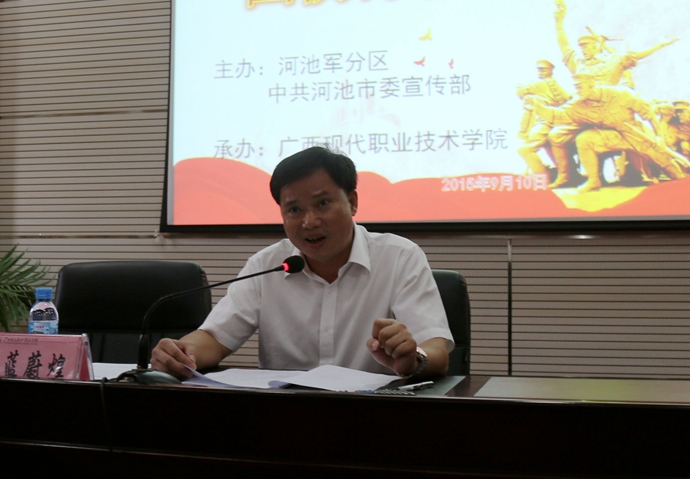 学院党委宣传部讯 9月10日,由河池军分区、河池市委宣传部主办,广西现代职业技术学院承办的河池市纪念中国人民抗日战争暨世界反法西斯战争胜利70周年国防形势教育报告会,在我院第二学术报告厅隆重举行。河池军分区参谋长袁军,河池市党史办主任蓝尉煌先后作国防形势报告。市委宣传部副部长杨合以及学院300多名师生参加报告会。报告会由学院副院长韦胜东主持。