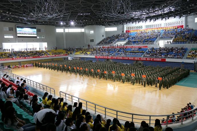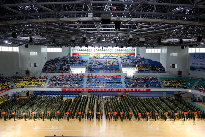 大会在雄壮的国歌声中拉开帷幕。下午3时,全场肃立,迎国旗、校旗,行注目礼。黄绍光院长在马宗伟副参谋长的陪同下检阅了2015级新生军训连近2000名参训新生组成的受阅方队。受阅方队精神饱满,热情高涨,以严整的军姿、昂扬的精神迎接检阅,随着黄院长响亮有力的“同志们好!”、“同志们辛苦了!”的问候,受阅方队“首长好!”、“为人民服务!”嘹亮的口号划破长空,在体育馆的上空此起彼伏,久久回荡。