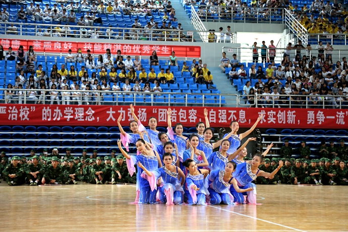 分列式后,文艺汇报表演开始,集中展示了我院师生风貌及专业教学成果。由学前专业的哥哥姐姐们表演的大型舞蹈表演《永远跟党走》《西山红云》,整齐且富有表现力的舞蹈动作激起了我们热爱党,热爱祖国、热爱和平的感情;由新生标兵代表组成的方阵展示搏击操表演,整齐刚劲的动作、坚定嘹亮的口号,展示着现代学子的自信和刚强;师生同台献艺的《红歌串烧》节目,充分展示我院师生积极向上的精神风貌;教官擒敌术表演更是吸足了整场观众的眼球,擒拿摔术,实摔的倒功、实战的擒敌,过硬的功夫、致敌的招数,男儿的刚强搏得观众连声叫“好”!