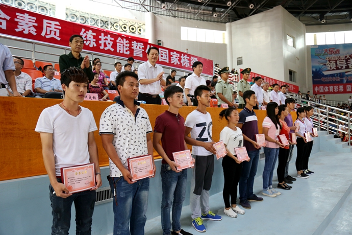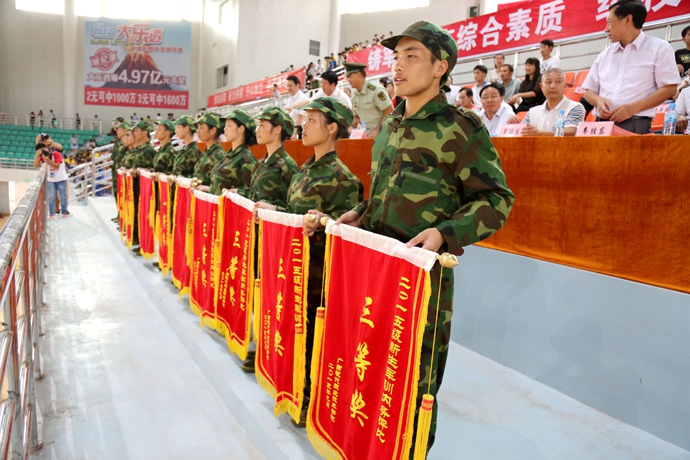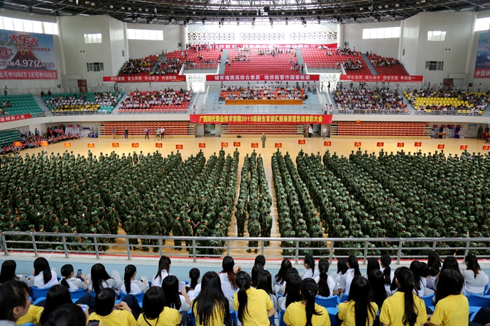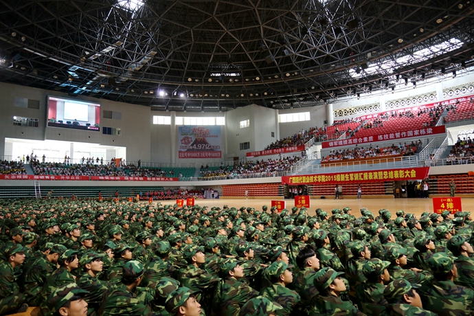学院党委宣传部讯 9月20日下午,我院2015级新生军训汇报表演暨总结表彰大会在体育馆隆重举行。市委副秘书长、学院党委书记韦伟松出席大会,学院党委副书记、院长黄绍光检阅军训学生方队。武警河池市支队副参谋长马宗伟、河池市教育局副调研员张发林、金城江区消防中队队长廖煌稳、学院纪委书记冉景峰、河池市职教中心常务副校长何成相、学院工会主席覃志航(副处级)、各县职教中心校长及相关领导出席大会。与会领导为获奖集体和个人颁奖。副院长韦胜东主持大会。