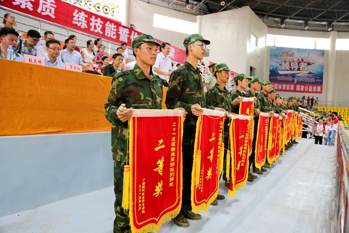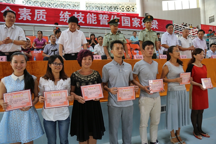 精彩汇报表演后,举行了军训先进集体、先进个人表彰仪式。学工处处长李铃宣读《广西现代职业技术学院关于表彰2015级学生军训优秀集体、优秀个人的决定》,表彰“优秀队列”15支、“优秀学员”25 人、“优秀辅导员、班主任” 8人、“优秀教官”13 人、“优秀班助”63 人,12个排 的12 3 间宿舍获得“内务优秀宿舍”。
