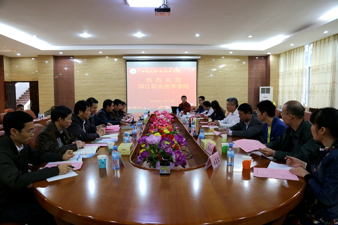 党委宣传部讯 11月11日,以陈廷镇副校长为团长的阳江职业技术学院考察团一行9人到我院参观考察。学院院长黄绍光、副院长韦胜东及机电工程系主要负责人及相关同志陪同考察或参加交流会。