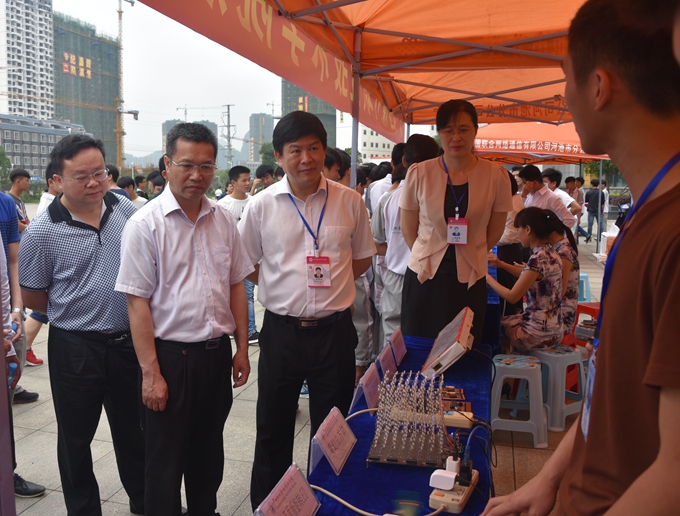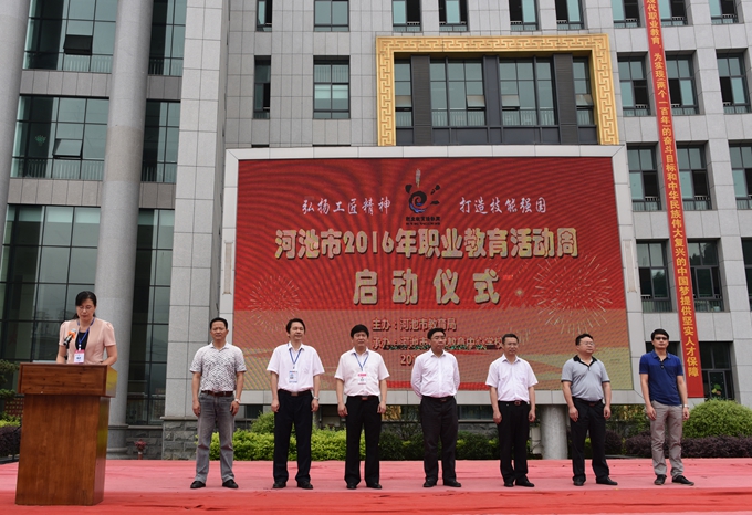 本站讯(宣传部 莫青青) 5月9日上午,由市教育局主办、市职业教育中心学校承办的2016年河池市职业教育活动周启动仪式在市职业教育中心学校立德楼前广场举行。市人民政府副秘书长潘扬权,我院党委书记韦伟松、院长黄绍光,市教育局副局长韦联克等领导出席了启动仪式。仪式由市职业教育中心学校党委书记黄丹峻主持。