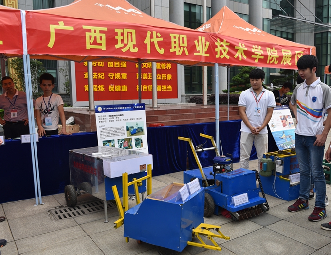 为贯彻落实好职业教育活动周的要求,我院积极筹备布展工作,结合各系部自身专业特色,在当天的现场展示活动中分别设立了4个展区。高效节能型浮选机、简易纸箱封箱机等在全区高校技能比赛中获一等奖的作品以及调酒、茶艺互动体验等均在活动中展示。启动仪式后,我院展区工作人员向参观领导及师生详细讲解展品,并进行现场展示,我院的专业技能成果展示获得了参观领导的一致好评。
