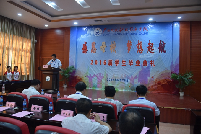 6月29日下午,我院2016届学生毕业典礼在学院第一第二学术报告厅隆重举行。学院院长黄绍光,副院长韦胜东等院领导出席毕业典礼,并为毕业生和优秀毕业生颁发毕业证书和荣誉证书。毕业典礼由副院长韦胜东主持。各系、各部门负责人,毕业班班主任、辅导员、教师代表、部分毕业生代表共1400多人参加了毕业典礼。