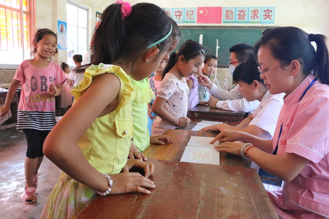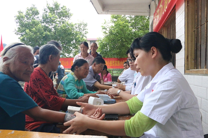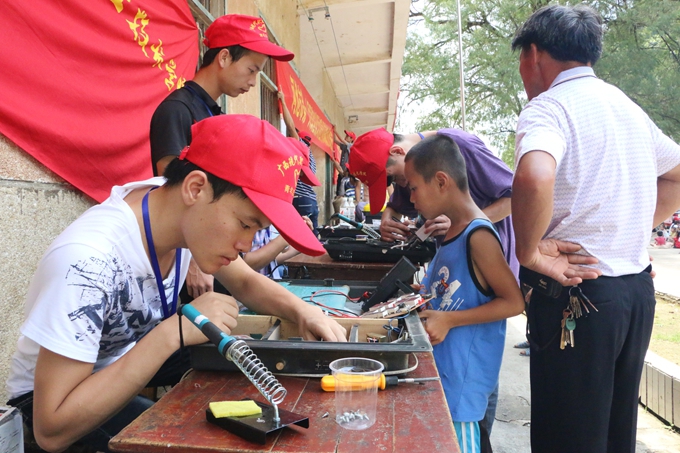 夏日炎炎也阻挡不了志愿者的服务热情,志愿者们组成支教文艺队、义诊队、义务维修队等,尽心尽力为当地群众服务。支教队的志愿者们带着小朋友们一起唱歌跳舞、进行妙趣横生的游戏拓展,为孩子们带去欢乐;在义诊区,来自医疗单位的专家们为群众宣传健康卫生、防艾、急救知识,为当地群众进行免费健康体检;义务维修队的小伙子们忙得热火朝天,为群众提供家电义务维修服务。